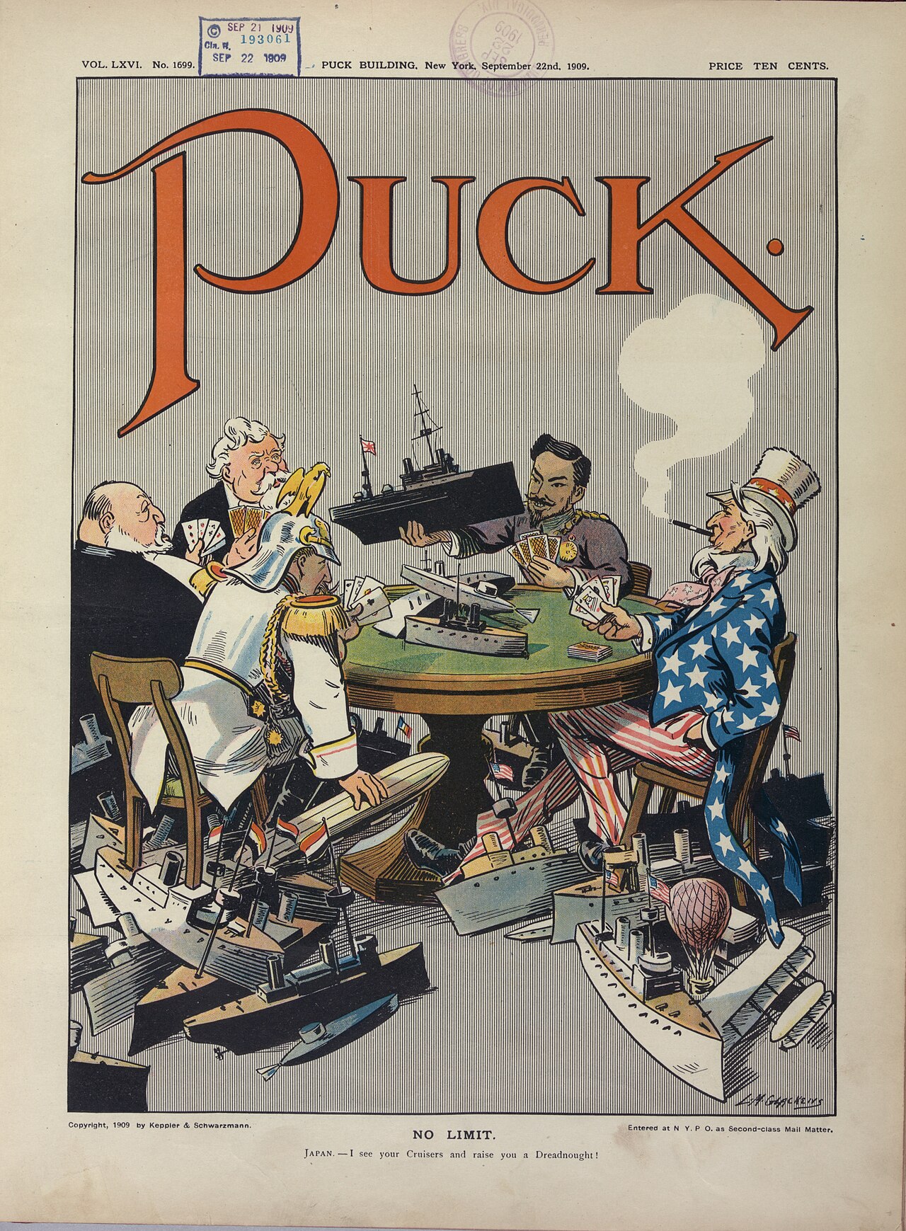 Карикатура 1909 года, опубликованная в журнале Puck, изображает пять стран, участвующих в морской гонке; кайзер изображен в белом.