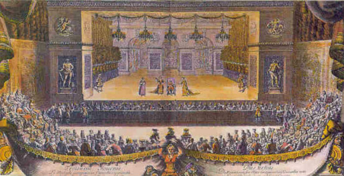 Жак Лепотр «Представление Мнимого больного Мольера в Версале», 1674. Гравюра.