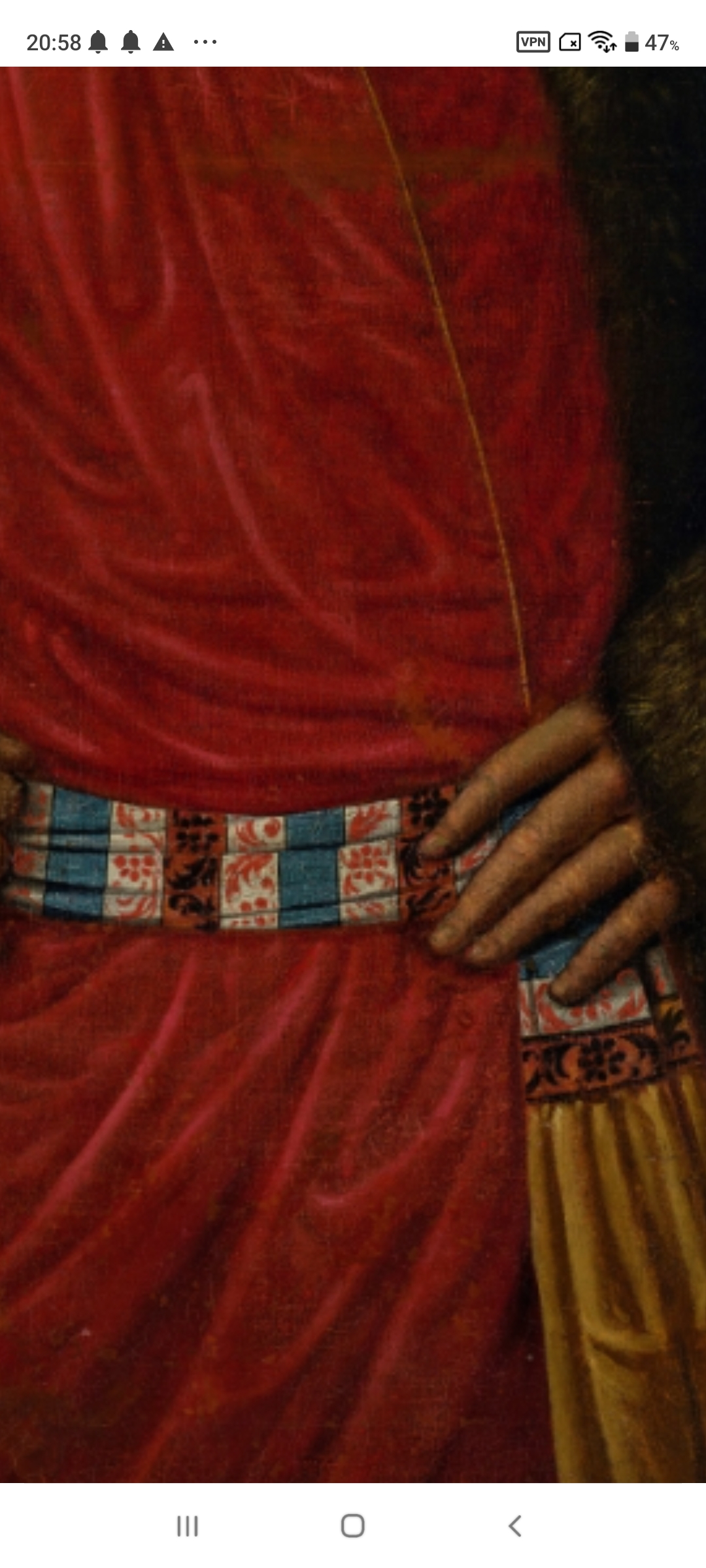 Эта картина интересна например тем, что здесь изображен головной убор, дополняющий эту красную одежду. Мне показалось, что этот головной убор имеет бардовый цвет и на нём есть что-то вроде золотых эмблем и, возможно, красной ленты.
