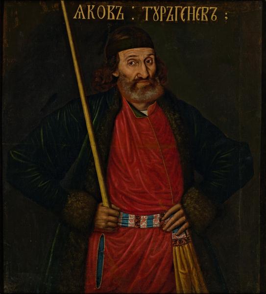 "Тургенев Яков Федорович (?–1695) был участником «Всепьянейшего сумасброднейшего собора всешутейшего князь-папы», сообщества, созданного Петром I для придворных увеселений. В том собрании Тургенев изображал «старого воина и киевского полковника», в роли которого он и запечатлен. Русский музей. От иконы до современности. СПб. 2015. С. 76.