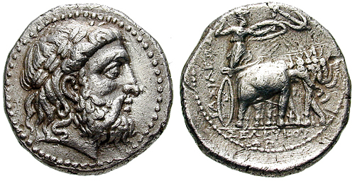 Тетрадрахма Селевка из Селевкии. Аверс: голова Зевса. Реверс: Афина со слонами.