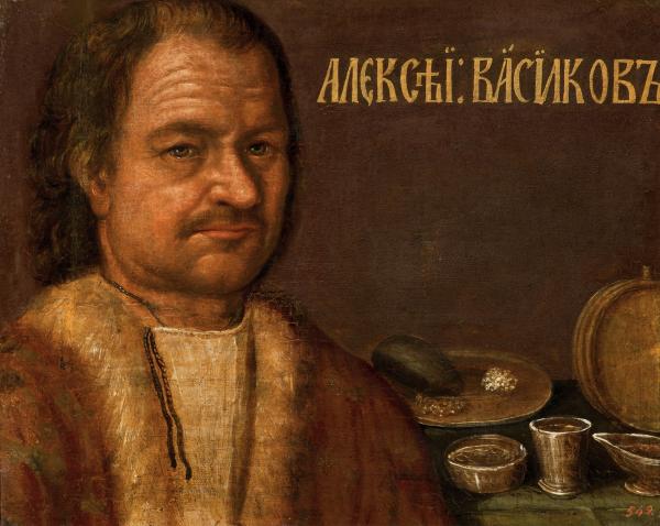 Несомненно, в отличие от изображений М. Ф. Нарышкина, Я. Ф. Тургенева, А. М. Апраксина, Ф. И. Веригина и Н. М. Жирового-Засекина, портрет Алексея Василькова написан после 30 августа 1698 года. Известно, что в 1699 и 1705 годах Петром I были изданы два «Указа о брадобритии», но приближенные царя едва ли нуждались в напоминаниях — на портрете Васильков изображен с маленькими, как у Петра, усиками. В 1700 подьячий Приказа ствольного дела Алексей Васильков продолжал службу в Оружейной палате в подчинении у назначенного в том же году дьяком Оружейного приказа известного «прибыльщика» (ответственного за изыскание доходов для государевой казны.) А. А. Курбатова, который писал царю: «Подьячий Алексей Васильков, которой у оружейных дел, усердия, государь, истинно никакого не имеет <…> Опасен я от нерадения его пьяного всякого бедства». Портрет кажется буквальной иллюстрацией этого письма, представляя изображенного на фоне штофа, чарок и тарелочки с соленым огурцом. Усердие «служителя Бахуса» в целом соответствовало нравам и обычаям «всепьянейших соборов».