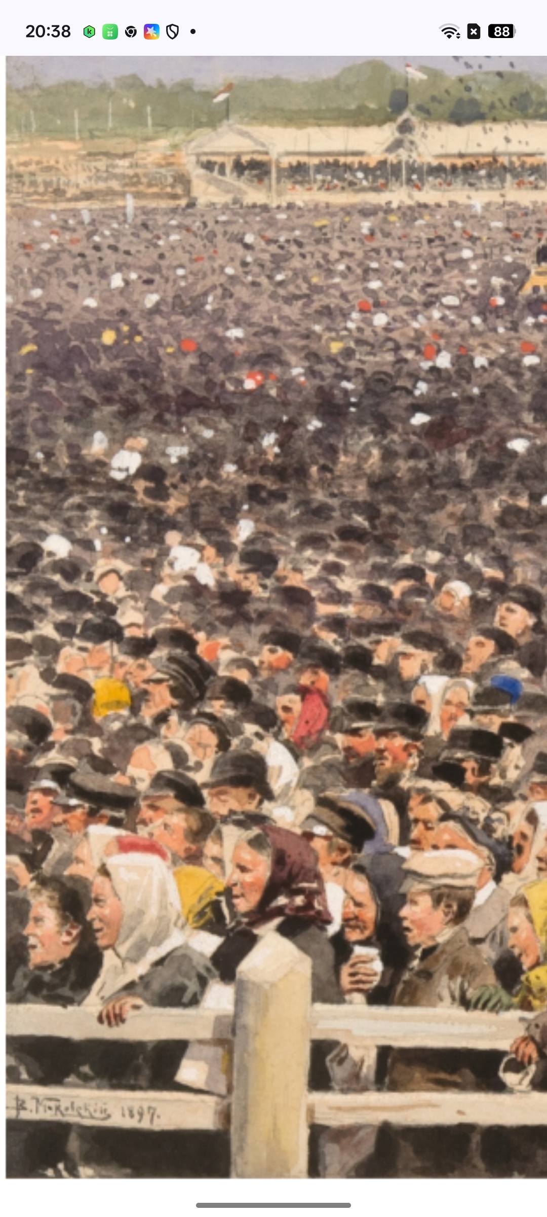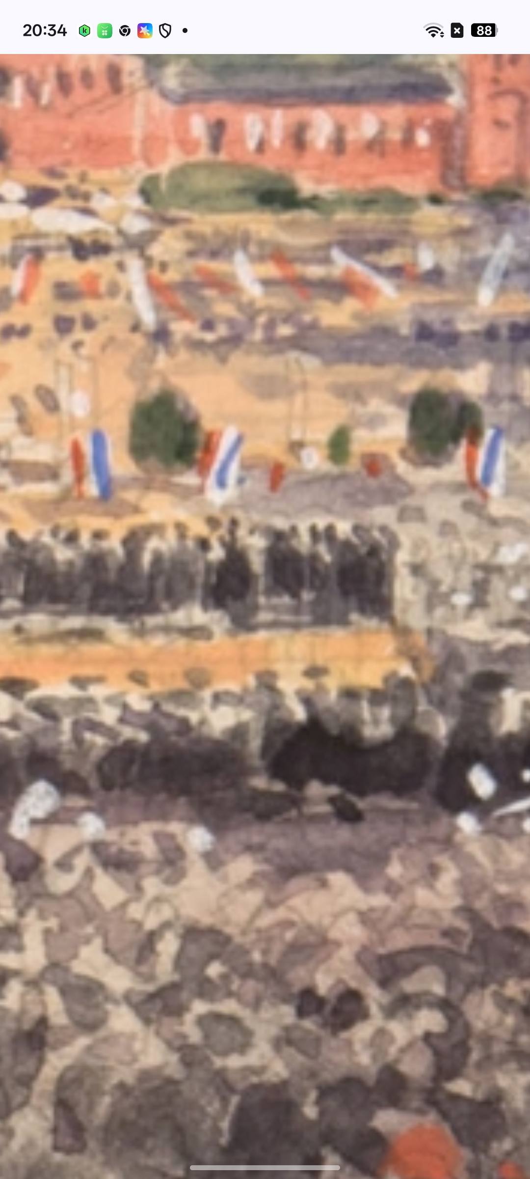Очень много флагов, но кажется, что их кто то затер на этой картине. Однако можно видеть красный цвет в верхней части вот этих флагов: