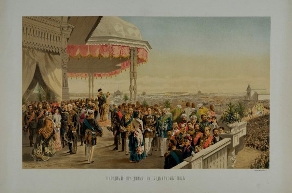 На изображении запечатлён народный праздник в честь коронации на Ходынском поле. На переднем плане — открытая веранда деревянного павильона, где находятся придворные и дипломатические представители.